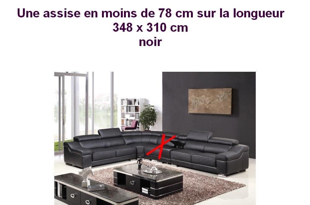 Récapitulatif de la commande canapé d'angle cuir buffle italien luxe londres noir, angle gauche, personnalisé sur mesure 348x310cm; une assise en moins de 78 cm sur la longueur, 6x sans frais, total commande : 2398 euros